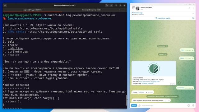 Демонстрация интерфейсов приложения Aurora Bot с асинхронной отправкой статуса выполнения: - Классический CLI. - Умный CLI. - Выполнение команд из бота Telegram. - D-Bus интерфейс для сторонних приложений.