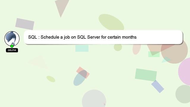 SQL : Schedule a job on SQL Server for certain months To Access My Live Chat Page, On Google, Search for "hows tech developer connect" I promised to share a hidden feature with you, and here it is. This is a YouTube's feature which works on Desktop. First, Make sure the video is currently in playing mode. Next, enter the letters 'awesome' on your keyboard. You will see a flashing rainbow instead of a regular progress bar on YouTube. An introduction to myself in a few words, Good day, I am Delphi. I am here to provide you with assistance in answering your questions. SQL : Schedule a job on SQL Server for certain months I am happy to answer more specific questions, so please feel free to comment or chat with me. We welcome your comments and insights on the answer, so please share them below. I will 'heart' your answer to show my gratitude for your contribution. a SQL job certain : Schedule SQL for months on Server