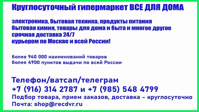 Прием заказов, консультации, доставка курьером - круглосуточно и без выходных! Тел/ватсап/телеграм/sms: +7 (916) 314 27 87 (текстовое сообщение, голосовое сообщение, голосовой вызов — на ваш выбор) Тел/sms/ватсап: +7 (985) 548 47 99 (текстовое сообщение, голосовое сообщение, голосовой вызов — на ваш выбор) Электронная почта recdvr@recdvr.ru (письмо в свободной форме)