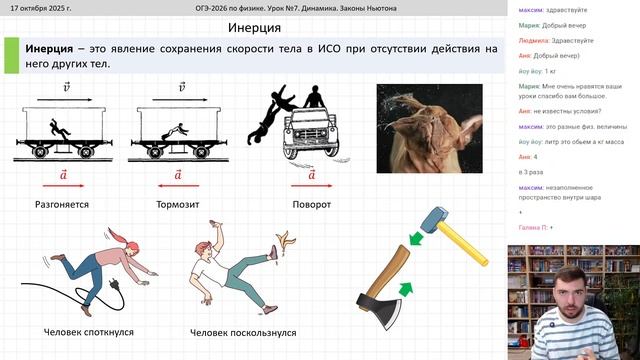 Друзья! Мы продолжаем наш курс подготовки к ОГЭ-2026 по физике. 17 октября (ПТ) в 18.00 (мск) продолжаем изучение раздела "Механические явления". Приступаем к динамике. На уроке поговорим о таких понятиях как масса, плотность, сила и изучим некоторые законы динамики - законы Ньютона и закон всемирного тяготения, а также будем решать задания ОГЭ. Приходите и обязательно приводите друзей. Ботать - так ботать! *** Мой личный телеграм-канал. Если кому-то интересно, присоединяйтесь - https://t.me/mbegunov 📌 Задания к уроку - https://vk.com/doc90548341_692049687 📝 Домашнее задание - https://vk.com/doc90548341_692049686 📖 Конспект урока - https://vk.ru/doc90548341_692181911 Таймкоды: 0:00 Начало 4:14 Что изучает динамика? 5:45 Масса тела 12:01 Плотность тела 23:42 Задание 1 27:13 Задание 2 29:02 Задание 3 35:17 Задание 4 38:52 Задание 5 41:31 Задание 6 50:44 Сила. Основные характеристики силы 1:03:04 Первый закон Ньютона. ИСО и НИСО 1:15:28 Инерция 1:24:26 Задание 7 1:24:47 Задание 8 1:27:53 Равнодействующая сила 1:29:36 Задание 9 1:33:10 Задание 10 1:37:14 Второй закон Ньютона 1:43:44 Задание 11 1:44:38 Задание 12 1:46:15 Задание 13 1:47:55 Третий закон Ньютона 1:52:15 Задание 14 1:52:41 Задание 15 2:01:12 Закон всемирного тяготения. Границы применимости ЗВТ 2:11:41 Задание 16 2:13:27 Задание 17 2:15:52 Ускорение свободного падения. Сила тяжести 2:20:44 Задание 18 2:22:46 Движение спутников 2:27:39 Задание 19 2:29:09 Задание 20 2:31:36 Задание 21 2:36:07 Задание 22 2:40:29 Не путайте законы Ньютона! 2:44:52 Ответы на вопросы Ссылки на запись урока: 🟦 ВКонтакте - https://vkvideo.ru/video-125374676_456271011 🟥 YouTube - https://www.youtube.com/live/k_fphdX_6FA 🟩 PhysEGE - https://physege.ru/mod/page/view.php?id=3950 📚 Полезные материалы для подготовки к ОГЭ по физике - https://bit.ly/3gbxegw ВКонтакте: 🅱️ Наша группа - https://vk.com/ege_phys 📅 Расписание трансляций - https://bit.ly/3d1De5B 💬 Общая беседа ОГЭ - https://vk.me/join/AJQ1dzY6WRjvCr3fg5RWafoJ 🔔 Подписывайтесь на рассылку в ВК - https://vk.com/app5748831_-125374676 💰 Помощь каналу - http://www.donationalerts.ru/r/bmegunov 📿 Дзен - https://dzen.ru/ege_phys 📬 Телеграм – https://t.me/physics_begunov 👨👨👧👧 Подписывайтесь на канал!