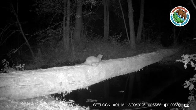 13.09.2025.Горностай.Заповедник Большая Кокшага.Зверек наблюдает за плывущим в воде бобром и убегает