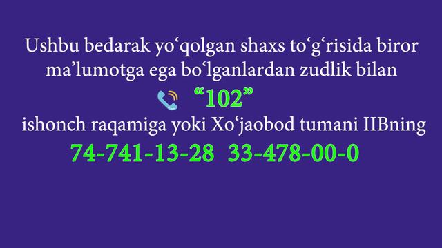 Xo‘jaobod tumani, Navbahor mahallasi, Qayrag‘och ko‘chasi 37-uyda yashovchi, 1996-yilda tug‘ilgan Mamirov Halimjon Karimjon o‘g‘li shu yilning 4-mart kuni yashash manzilidan nomaʼlum tomonga chiqib ketib, qaytib kelmasdan bedarak yo‘qolganligi uchun qidirilmoqda. Ushbu bedarak yo‘qolgan shaxs to‘g‘risida biror maʼlumotga ega bo‘lganlardan zudlik bilan “102” ishonch raqamiga yoki Xo‘jaobod tumani IIBning 74-741-13-28, 33-478-00-00 , 97-980-22-33, 93-505-21-21 telefon raqamlariga xabar berishingiz so‘raladi! Bedarak yo‘qolib, qidirilayotgan Mamirov Halimjon Karimjon o‘g‘lining topilishida yaqinlariga ko‘maklashaylik!