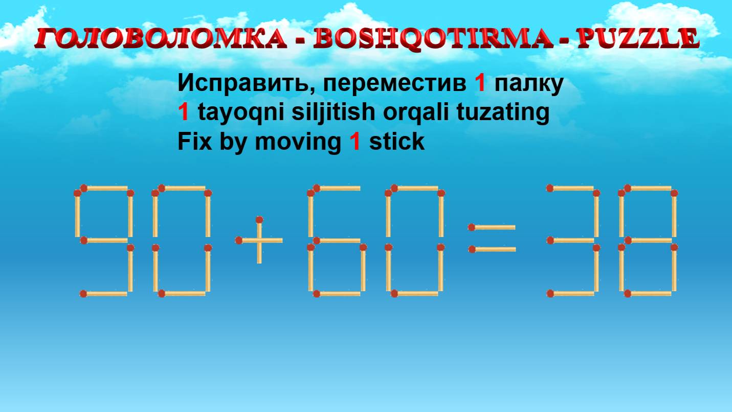 ГОЛОВОЛОМКА - BOSHQOTIRMA – PUZZLE. Спичка. 90+60=38, 96-39=63, 95+26=65, 99-25=60