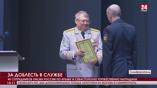 В Симферополе во Дворце культуры профсоюзов для сотрудников УФСИН России по Республике Крым и г. Севастополю состоялось торжественное мероприятие, посвященное празднованию 144-й годовщины со дня образования уголовно-исполнительной системы Российской Федерации. Открывая мероприятие, начальник регионального УФСИН Вадим Булгаков поздравил всех сотрудников и ветеранов уголовно-исполнительной системы республики с профессиональным праздником, отметив, что служба в УИС – это сложная и напряженная работа, требующая полной самоотдачи, мужества и терпения. Благодаря повседневному труду личного состава ведомства в обществе сохраняются мир и безопасность, спокойствие и стабильность, восстанавливается справедливость, предупреждаются преступления. Особые слова благодарности Вадим Булгаков выразил ветеранам уголовно-исполнительной системы, которые и сегодня вносят неоценимый вклад в воспитание молодых сотрудников, щедро делятся своими профессиональными знаниями и богатым жизненным опытом, наполненным примерами стойкости и самопожертвования. После приветственных слов состоялась торжественная церемония награждения, в ходе которой за достижение высоких показателей в служебной деятельности, усердие и профессионализм, проявленные при исполнении должностных обязанностей, отличившимся работникам пенитенциарного ведомства были вручены ведомственные награды: медали, почетные грамоты и благодарности, а ветеранам УИС Крыма - благодарственные письма. Также ряд сотрудников УФСИН был отмечен Благодарностями Главы Республики Крым и Благодарностями Председателя Государственного Совета Республики Крым. В завершение мероприятия для всех присутствующих состоялся праздничный концерт, на котором с яркими номерами выступили творческие коллективы республики.