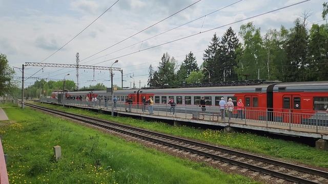 Платформа Взлётная перегон Белые Столбы - Домодедово Московская железная дорога 0:00 - ЧС7-321 с вагон-лабораториями и прибывающая ЭД4М-0149 в 13:40:33 0:53 - ЧС7-282 с поездом №176 Симферополь-Москва в 13:45:29