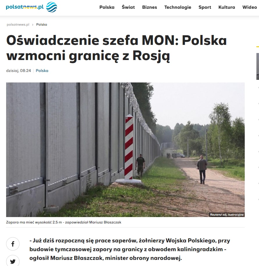 Польша начала строить забор на границе с Калининградской областью. Об этом заявил министр обороны страны Мариуш Блащчак. Причина усиления границы, по его словам, в том, что аэропорт Калининграда открыт для рейсов из Ближнего Востока и Африки.