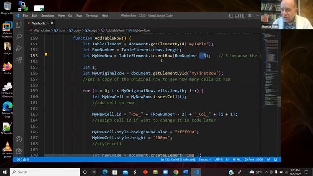 In this video we look at an HTML page that has a table with img elements in the cells. The image source files are transparent gifs, so the color of the cell shows through. The JavaScript allows the user to add a row to the table or to add a column to the table. The JavaScript also allows the user to specify one of the cells by selecting its row and column and then either changing the src of the image (change the picture) or changing the color of the td element (table cell).