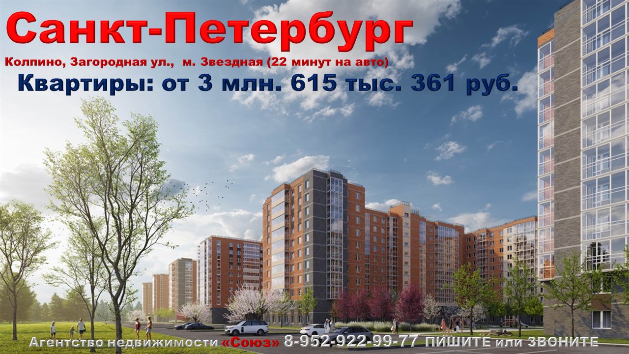 Подпишитесь на нас. Благодарим !!! https://www.youtube.com/@nedvigimoct/videos - мы на Ютубе https://dzen.ru/nedvigimoct?tab=longs&utm_referrer=dzen.ru - мы на Дзене https://rutube.ru/channel/27083000/videos/ - мы на Рутубе https://vk.com/club223108371 - мы в ВК https://ok.ru/lyubayan - мы в Ок Агентство недвижимости «СОЮЗ» Покупайте: квартиру в Санкт-Петербурге. Колпино г., Загородная ул., м. Звездная (22 минут на авто) Агент по новостройкам: 89529229977 (WhatsApp) Цены на квартиры точно такие же как и у застройщика. Заплатим за вас первоначальный взнос или вернем кешбэк в размере первоначального взноса по ипотеке за 60 дней. Акция распространяется на ограниченный список квартир и не суммируется с другими скидками и спецпредложениями. В ней участвуют только квартиры от застройщика. Квартиры продаются БЕЗ РИЭЛТОРСКОЙ КОМИССИИ !!!. Ст. квартиры: от 3 млн. 615 тыс. 361 руб. Ежемесячный платеж: 17 319 руб. при ставке 6% Площадь общая: 21,13 м2 - 33,31 м2 1к. квартиры: от 4 млн. 770 тыс. 264 руб. Ежемесячный платеж: 22 852 руб. при ставке 6% Площадь общая: 30,1 м2 - 47,79 м2 2к. квартиры: от 6 млн. 627 тыс. 772 руб. Ежемесячный платеж: 31 750 руб. при ставке 6% Площадь общая: 46,14 м2 - 60,57 м2 3к. квартиры: от 9 млн. 410 тыс. 634 руб. Ежемесячный платеж: 45 081 руб. при ставке 6% Площадь общая: 58,95 м2 - 88,95 м2 Срок сдачи: 2 кв. 2024 - 4 кв. 2025 Срок выдачи ключей: 4 кв. 2024 - 4 кв. 2026 Договор: ДДУ Тип дома: кирпично-монолитный Тип отделки: отделка "под ключ" Парковка: есть Потолки: 2,58 м. Преимущества:отделка "под ключ".Комплексное развитие территории. Собственная инфраструктура. Дворы с зонами отдыха. Новый детский сад и школа. Транспортная доступность. Описание комплекса: Жилой квартал расположен в Колпинском районе Санкт-Петербурга между Колпино и поселком Понтонный. Сюда удобно добираться общественным и личным транспортом. Путь до ст. метро «Рыбацкое» займет минут 20 на автобусе No 327, который курсирует регулярно. До центра Колпино можно доехать за 10-20 минут на автобусах No 332, 336, 387, 327, 337, 337 А. Недалеко от квартала находятся ж/д станции: «Колпино» и «Понтонная», откуда на электричке за полчаса можно добраться до Московского вокзала. Автомобилисты могут доехать по многорядной Софийской ул., а дальше — на КАД или в Купчино, либо по Шлиссельбургскому пр. через Рыбацкое, далее по КАДу или по набережной в центр Санкт-Петербурга. Круглосуточное видеонаблюдение в парадных и во дворе — обязательный элемент системы безопасности строящегося микрорайона. Дизайнерское оформление мест общего пользования в ярких и дружелюбных цветах создаст настроение в парадных. Скоростные, бесшумные лифты с безредукторными лебедками, зеркалами и хромироваными поручнями появятся в каждой парадной. Благодаря средней этажности, квартал будет выглядеть весьма уютно. Добавят ему прелести и зеленые дворы с благоустроенными пешеходными зонами, спортивными и детскими площадками. Любители велопрогулок могут оставить велосипед на специальных парковках. Меньше города, больше зелени: в жилом квартале при строительстве сохраняют все растущие деревья, а также высаживают много новых деревьев, кустарников и цветов. Преимущество для автолюбителей — широкие проезды для транспорта с двумя проезжими частями, шириной не менее 6 м каждая — это 4 полноценные полосы движения. Реализована концепция «двор без машин»: дворовое пространство используется для прогулок, отдыха и игр, а просторные парковки с разметкой расположены не около парадных, а по периметру дворовой террит