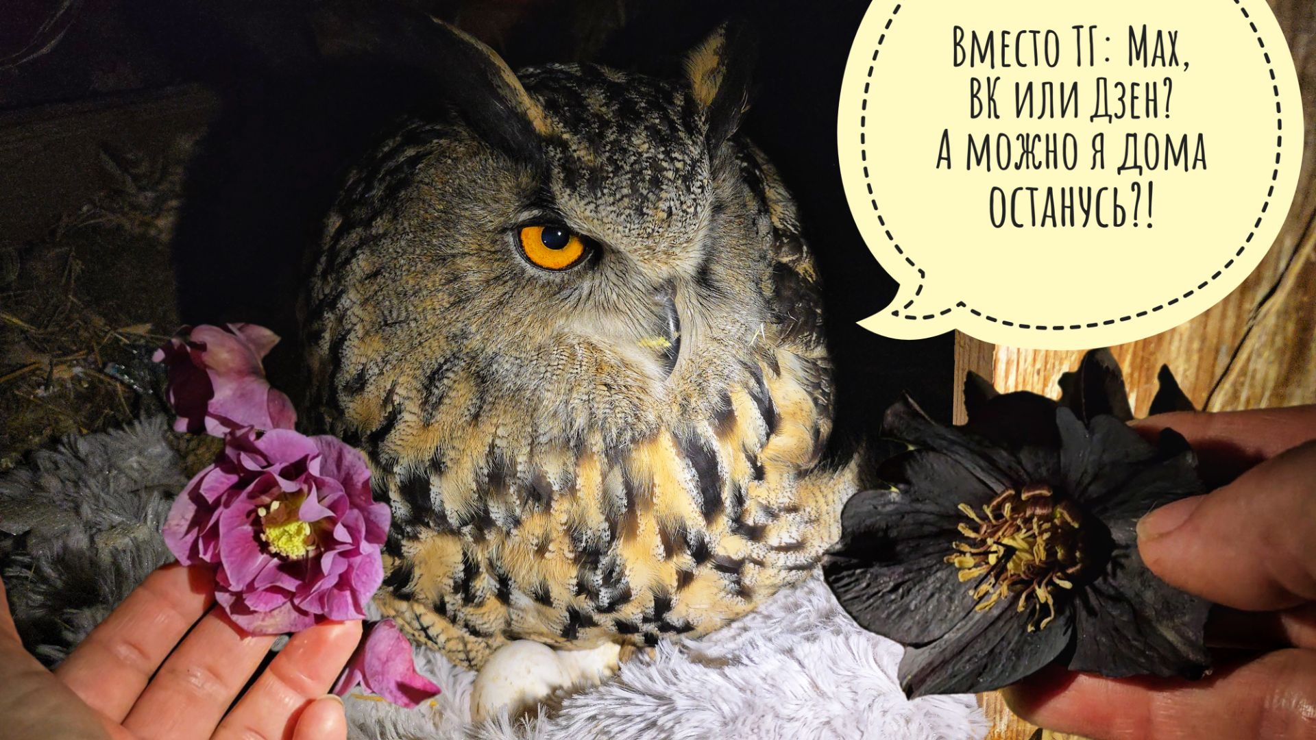 Сова Ёль занята важным делом, а я в темноте цветочки показываю и про интернетские проблемы говорю