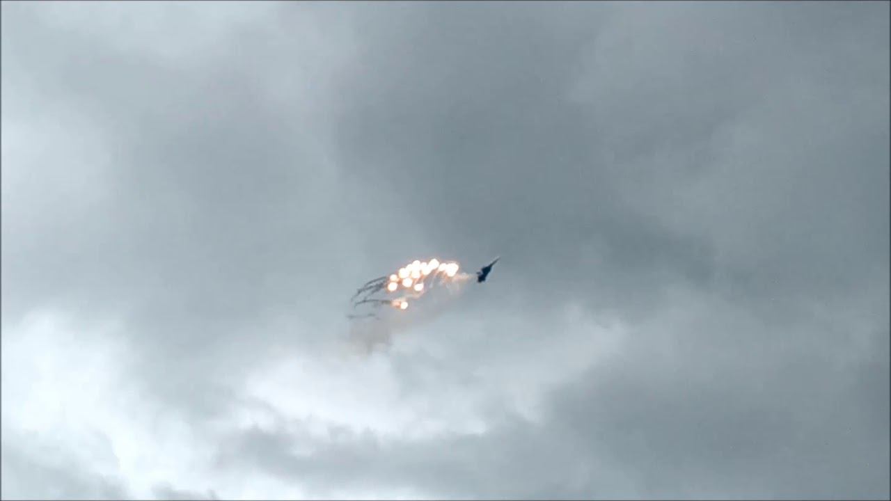 Сверхманевренный многофункциональный истребитель Су-30СМ показывает салют в небе над Кубинкой.