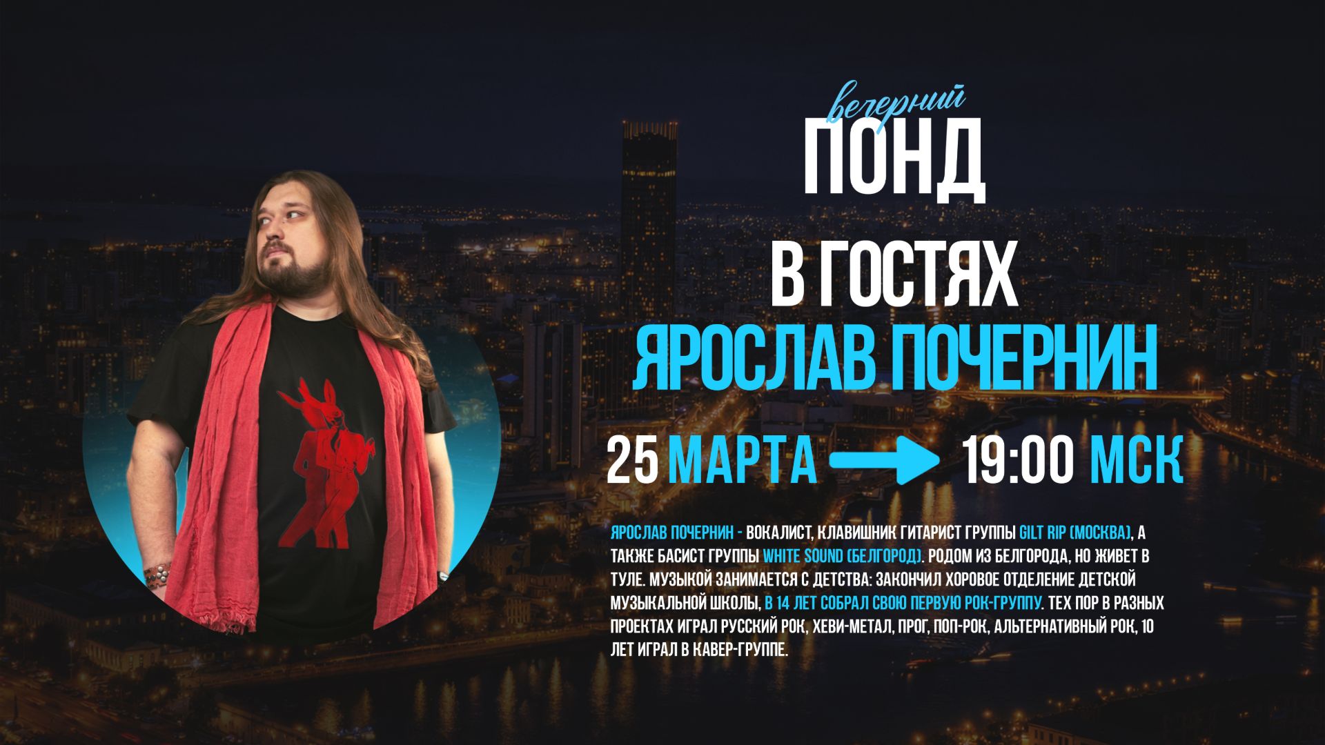 Запись эфира «Вечернего Понда» — передачи для тех, кто считает, что без музыки вечер прошел зря. Хочешь попасть на следующий стрим, прислать свой трек на разбор или просто пообщаться в уютном музыкальном чате? 🎧 Все эфиры проходят здесь: https://vk.com/vecherniy.pond Подписывайся на «Вечерний Понд» ВКонтакте, чтобы не пропускать новые выпуски и узнавать о гостях первым! Там же можно почитать новости и поучаствовать в жизни сообщества.