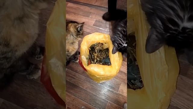Ты первая! Нет - ты! Кошки впервые увидели раков, немного струхнули и не поняли что с ними делать!