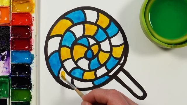 Рисование леденца на палочке, раскрашивание и раскраска для детей акварелью