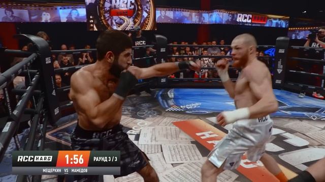 Вячеслав Мещеркин и Замир Мамедов устроили настоящую бойню в ринге! Мамедов оформил нокдаун и забрал победу решением судей на RCC Hard 12 Стартовый раунд бойцы взяли на разведку, во втором Мещеркин пошел вперед, но наткнулся на боковой Мамедова и оказался в нокдауне. В третьем раунде уже Бешеный бык буквально избивал Мамедова и разбил сопернику лицо, но Замир выстоял и забрал победу судейским решением.