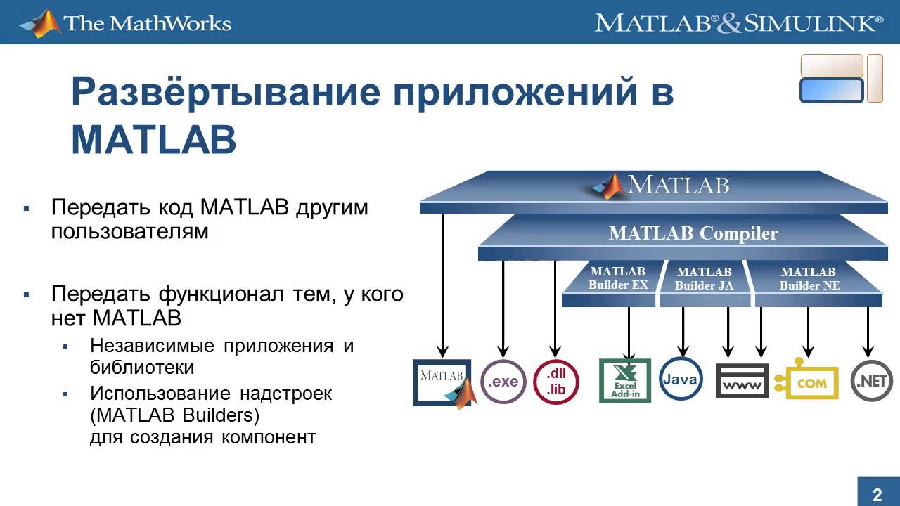 Создание и развертывание внешних приложений с помощью MATLAB Compiler и MATLAB Builder. Возможность передать функционал тем пользователям, у которых нет MATLAB