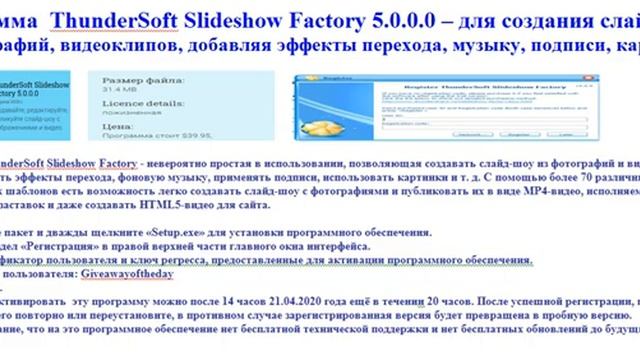 Доступна бесплатно программма ThunderSoft Slideshow Factory 5.0.0.0 - для создания слайд-шоу из фотографий, видеоклипов, добавляя эффекты перехода, музыку, подписи, картинки и т. д. источник https://ru.giveawayoftheday.com/thundersoft-slideshow-factory-5-0-0-0