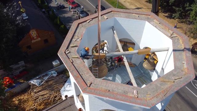 Поднятие купола на главный барабан храма и установка колоколов и шатра на колокольню