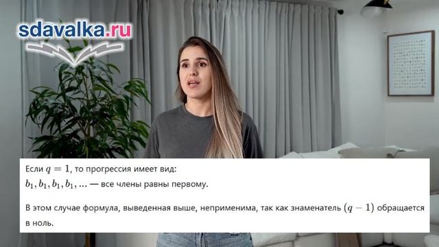 Вывод формулы суммы для случая q ≠ 1 методом умножения и вычитания: Sₙ = b₁(qⁿ - 1)/(q-1). Анализ случая q = 1: Sₙ = n*b₁. Подготовка и обучение школьников с помощью ИИ: https://sdavalka.ru/. Как работать? - Зарегистрируйтесь. - Найдите нужный предмет и класс. - Изучите материалы по урокам: текст, понятный ученикам, сжатый видеоурок с ИИ. - Пройдите тренировочный тест (можно проходить бесконечно, для усвоения материала). - Уверены, сдавайте экзаменационный тест! - И так по каждой теме. - В конце итоговый тест. - Сдадите все - сдадите любой экзамен! Системы дистанционного образования, контент: https://ecre.ru/ Подготовка для ВУЗов и СУЗов: https://mexam.ru/