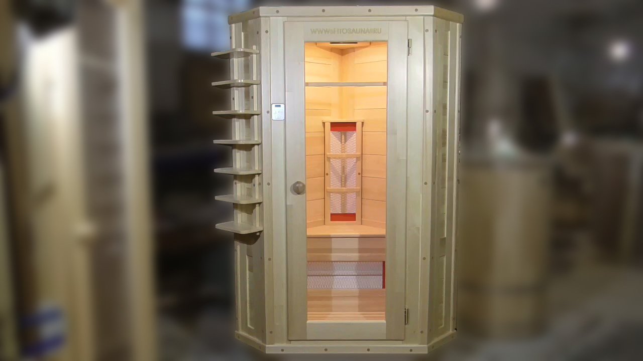 Видеообзор одноместной угловой кедровой ик-сауны с наружными полочками
