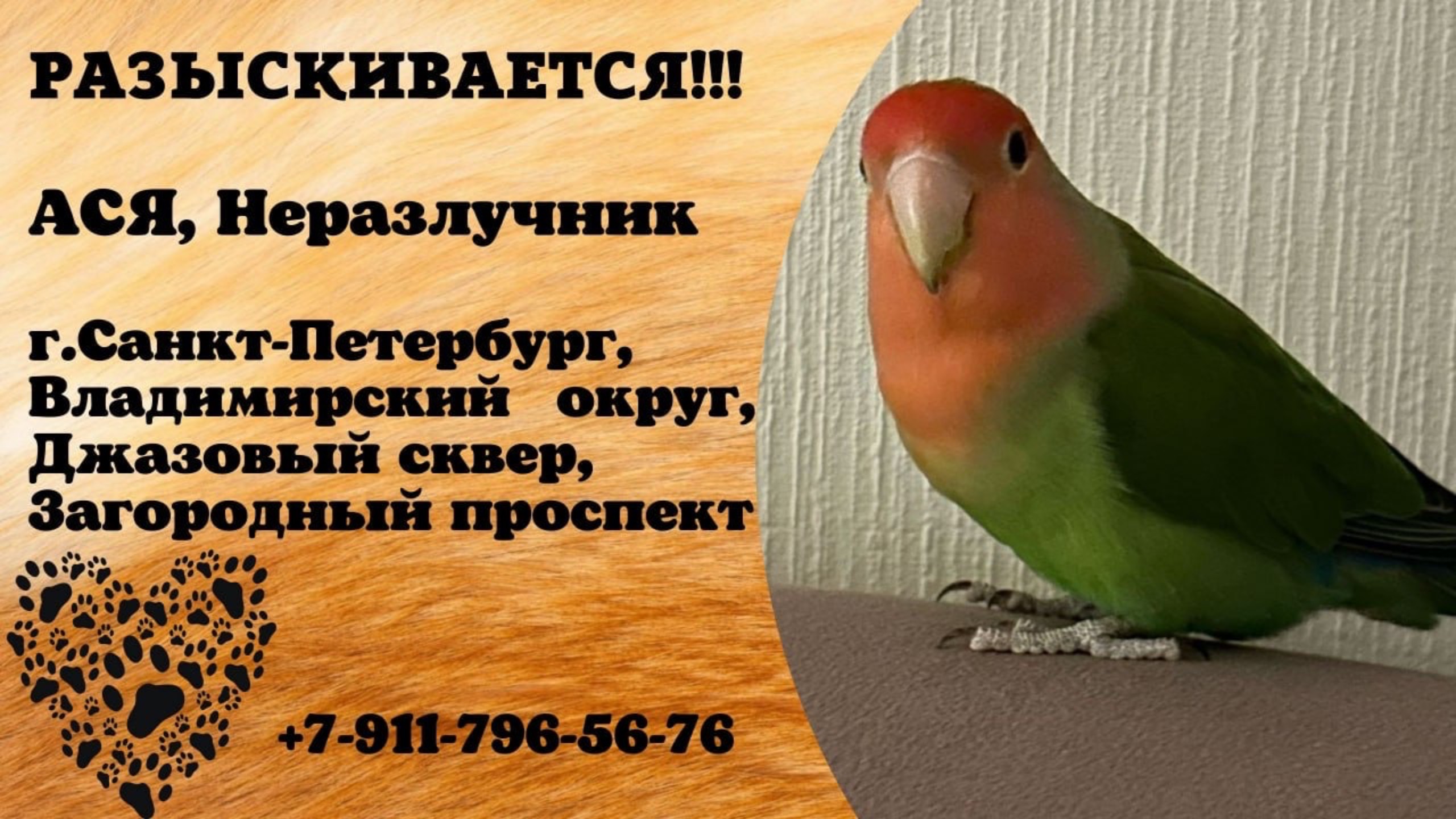 Пропал попугай! АСЯ, Неразлучник. г.Санкт-Петербург, Владимирский округ.