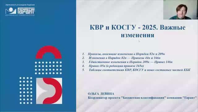Вернемся к анализу нормативных документов, регламентирующих бюджетную классификацию на 2025 год, в том числе и с учетом поступающих вопросов в компанию ГАРАНТ. Подробнее расскажет Ольга Левина - координатор проекта "Бюджетная классификация" компании "Гарант", советник государственной гражданской службы 1 класса. __________ Получить бесплатный доступ к системе ГАРАНТ https://garant.pravovest.ru/ __________ ТАЙМКОДЫ: 00:00 В этом видео 01:07 Приказы, вносящие изменения в Порядки 82н и 209н 01:50 Приказ 44н. Новые КВР 248 и 416 03:30 Приказ 44н. Изменения в КВР 247 05:05 Приказ 166н. Изменения кодов доходов. Новое: АнКВД 630. Изменения в АнКВД 120. 06:45 Приказ 166н. Изменения кодов расходов. КВР 321, 322, 340, 853, 211, 214. 08:49 Приказ 166н. Изменения кодов расходов. Новая группа 890 и изменения в 810. 11:40 Изменения в 209н. КОСГУ 228. Консервация объекта незавершенного строительства. 14:42 Приказ 85н. Изменения в связи с новыми нормами налогового законодательства. 16:20 Таблицы соответствия составных частей КБК