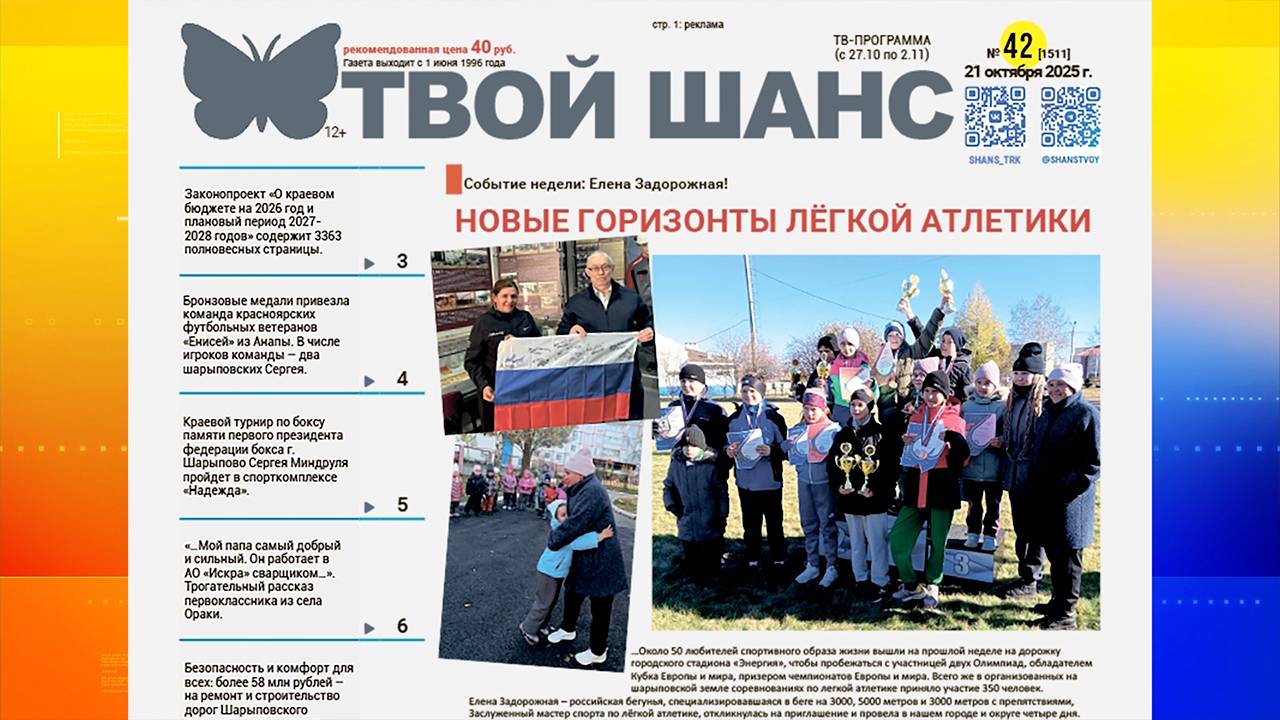 Как прошли соревнования по бегу под руководством заслуженного мастера спорта Елены Задорожной? Читайте большой репортаж на страницах газеты. Собрали для вас важные краевые новости на странице 3. 58 миллионов рублей на ремонт и строительство дорог в округе потрачено в 2025 году. Как всегда, свежие вакансии, объявления недвижимости, сканворд, гороскоп и конечно телепрограмма – всё это вы найдете в еженедельнике «Твой Шанс»!