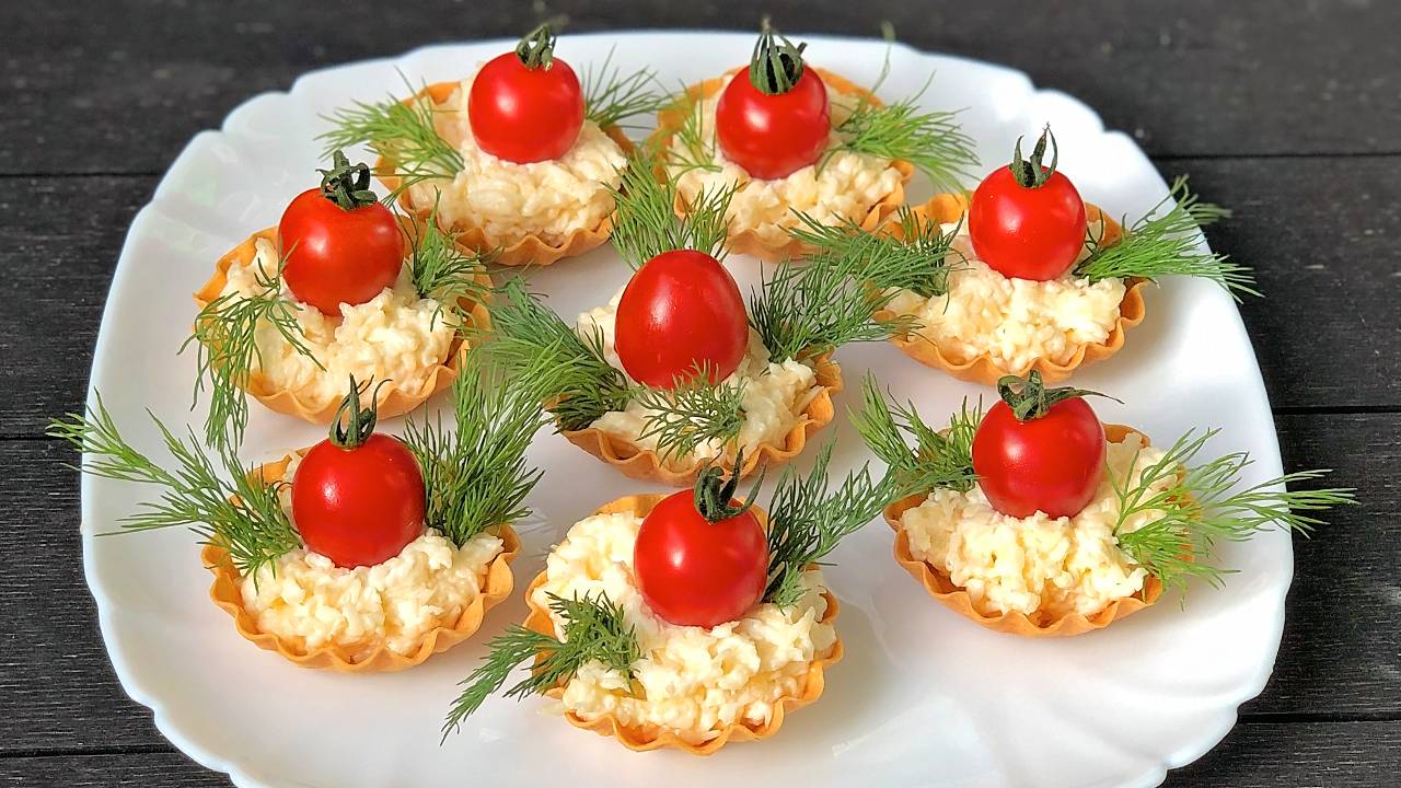 Быстрая закуска на праздничный стол. Тарталетки с сыром и помидорами.