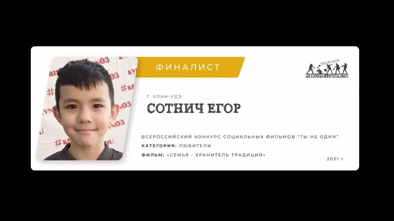 8 июля состоялся финал четвертого Всероссийского конкурса социальных фильмов «Ты не один»: показ лучших работ, объявление и награждение победителей. Конкурс проводит Высшая школа режиссеров и сценаристов в Санкт-Петербурге среди социальных роликов до 3-х минут и сценариев социальных роликов. Цель конкурса — привлечение внимание общества к социальным проблемам, а также поиск и поддержка талантливой молодежи. Авторитетное жюри из режиссеров, операторов, сценаристов, продюсеров киностудии «Ленфильм», членов Союза кинематографистов России внимательно изучило свыше 400 работ со всех уголков страны. Виктор Иванович Бутурлин, режиссер-постановщик известный зрителю по таким фильмам и сериалам как «Аплодисменты, аплодисменты…», «Улицы разбитых фонарей», «Убойная сила»; Валерий Владимирович Мартынов - оператор-постановщик фильмов "Особенности национальной рыбалки", «Сёстры» и другие ярко обсуждали каждого конкурсанта. Ролик «Семья – хранитель традиций» ученика 5 класса гимназии №33 г. Улан-Удэ стал победителем престижного конкурса. Александр Борисович Андреев - генеральный продюсер кинокомпании "Балтфильм" отметил юного участника: «Хочется отметить батыра Сотнича Егора. Молодец, интересный мальчик, подаёт всё очень хорошо!» Светлана Валерьевна Федина - руководитель Конкурса "Ты не один", директор Высшей школы режиссеров и сценаристов прокомментировала: «Егор - уже победитель. Один из трех и об этом объявлено. Победу ему присудило жюри. Это большое признание! Поздравляем Егора!» #ВШРиС #ТыНеОдин #ТНО #ТыНеОдин #достижения #кино #творчество #рдш03 #РДШ