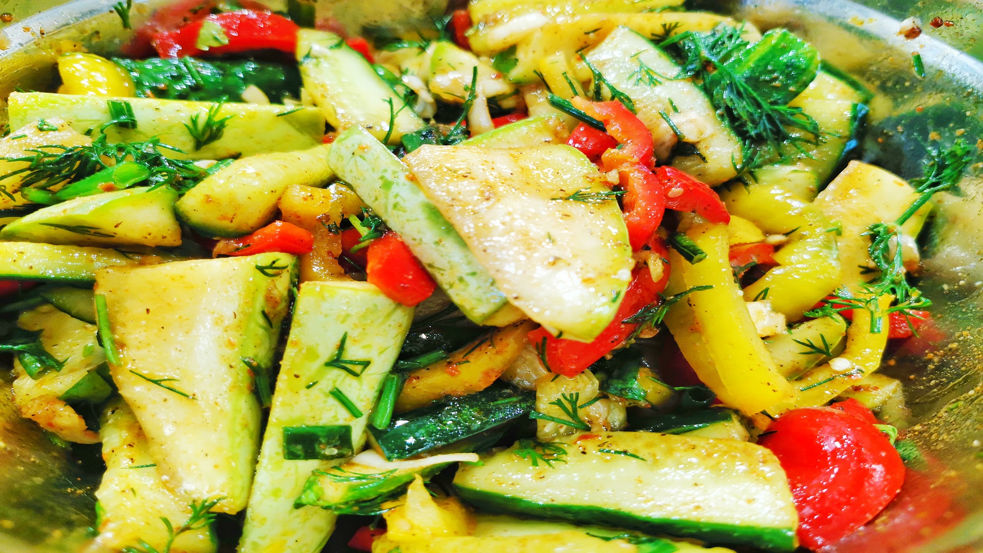 Один кабачок + три огурца, заливаю кипящим маслом и получаю изумительный, вкусный салат без майонеза