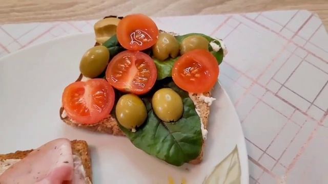 2 тостовых хлеба из цельнозерновой муки намащала мягким творожным сыром сверху положила листья мангольда, можно любой листовой салат. добавила несколько кружочков помидора, несколько оливок. на другой кусочек хлеба положила куриную колбасу. так-же кофе с молоком.