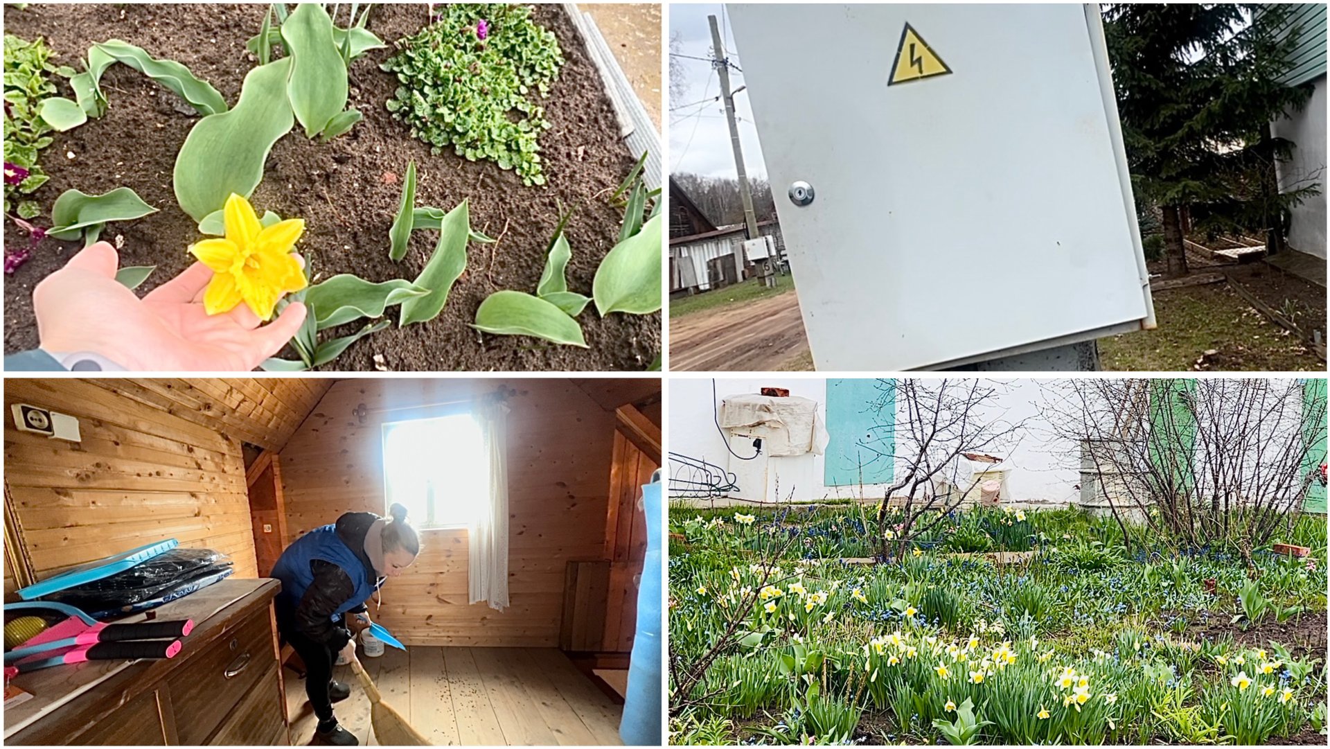1 мая. На даче. Взломали счетчик с автоматами. Уборка. Установка розеток. Первая зелень на салат.