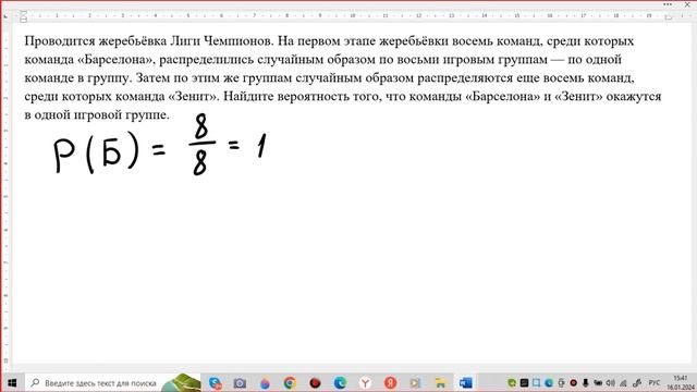 Домашнее задание - гугл-тест https://forms.gle/jonugZN8NSfCZYim9 Этот же тест можно распечатать https://vk.com/doc12981903_673708595?hash=ctefPbuqiDpTO8YEQ2HiaRVXt5oxiCCd8jKa3xwN0dw&dl=jPGKk6WxtPKQUI0GjyHkmMewsXDEaZOZJx9Z0kRQISD Рабочая тетрадь со всеми прототипами этого задания (простая теория вероятности) https://vk.com/doc12981903_673708654?hash=gzb6nqkLcnpsvzEzeOsaB487b9wHLZGXwibor8eSRi4&dl=S2o3pnbw1XZcYlzSzMpp3gLDZAzmk3nFr3GLWO5jGZw Моя группа в ВК https://vk.com/clubinnaleonidovna Проводится жеребьёвка Лиги Чемпионов. На первом этапе жеребьёвки восемь команд, среди которых команда «Барселона», распределились случайным образом по восьми игровым группам — по одной команде в группу. Затем по этим же группам случайным образом распределяются еще восемь команд, среди которых команда «Зенит». Найдите вероятность того, что команды «Барселона» и «Зенит» окажутся в одной игровой группе.