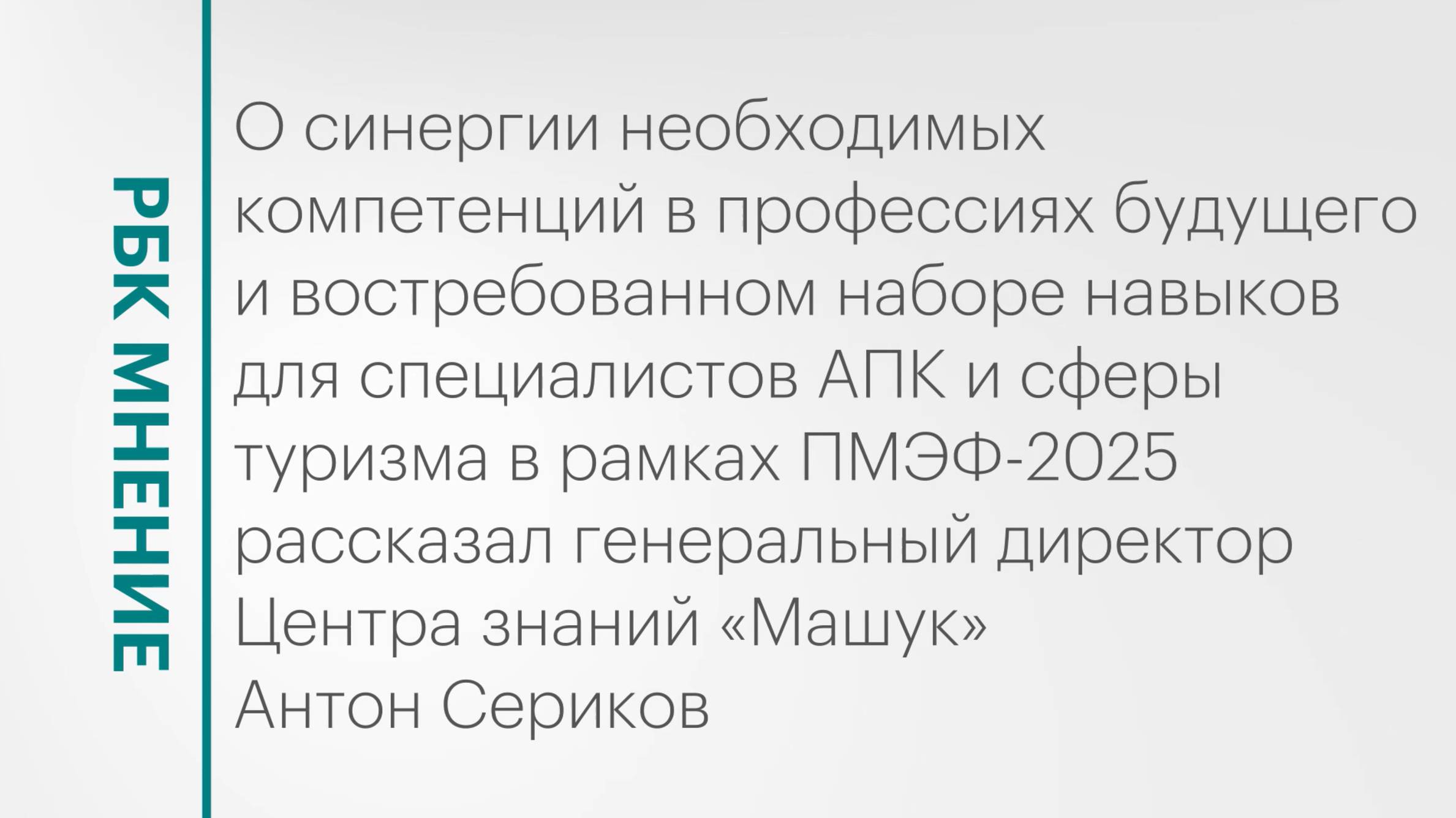 О синергии необходимых компетенций в профессиях будущего и востребованном наборе навыков для специалистов АПК и сферы туризма в рамках ПМЭФ-2025 рассказал генеральный директор Центра знаний «Машук» Антон Сериков. Подписывайтесь на нас в социальных сетях: ВКонтакте: https://vk.com/rbcyug Telegram: https://t.me/rbc_krasnodar, https://t.me/rbcrostov, https://t.me/rbc_kavkaz Подпишитесь на канал РБК Юг, чтобы смотреть новые выпуски первыми!