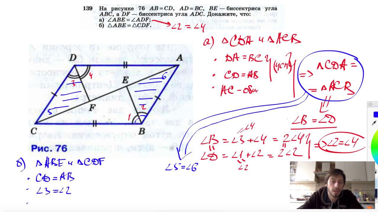 №139. На рисунке 76 АВ = CD, AD = ВС, BE — биссектриса угла ABC, a DF — биссектриса угла ADC. Докажите, что: а) ∠ABE = ∠ADF; б) ΔABE=ΔCDF. Поддержать канал рублём - 5469400944002125 (Сбербанк) Мой второй канал для подготовки к ЕГЭ и ОГЭ - https://www.youtube.com/ЕвгенийСумин Инстаграм - https://www.instagram.com/EGE_OGE.math Личный инстаграм - https://www.instagram.com/ee_sumin VK - https://vk.com/evgeniysumin FB - https://www.facebook.com/EvgeniySumin