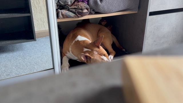 Минибультерьер, шкаф вместо будки