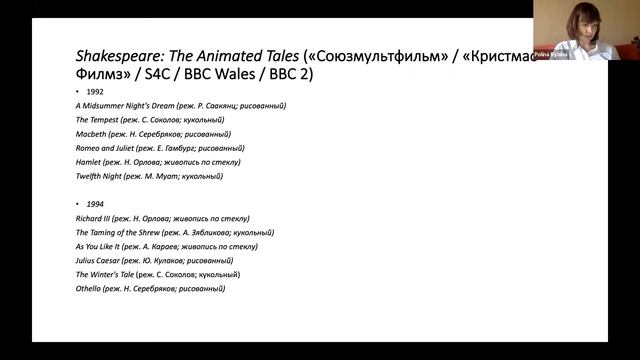 29 октября 2020 г. в рамках Международной научной конференции «Шекспировские чтения 2020» состоялась секция «Шекспир в кинематографе и визуальной культуре». (модератор — И. И. Лисович) Я. А. Кабалевская (МГК имени П. И. Чайковского, Москва) «Массовая культура пожаловала во владения Просперо». «Буря» Шекспира в мировом кинематографе П. Ю. Рыбина (МГУ имени М. В. Ломоносова, Москва) Анимационный Шекспир: возможности, ограничения и случайности производства