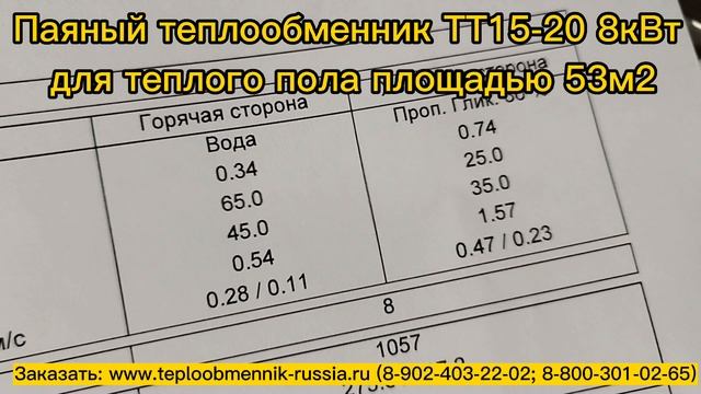 Цена на дату 16.12.22г. 8 600 руб. Паяный теплообменник ТТ15-20 для теплых полов. Аппарат обладает следующими характеристиками: 1. Мощность - 8кВт. 2. Греющий теплоноситель (вода). Вход:65С, Выход:45С 3. В контуре теплого пола залит проп. гликоль 30% (или вода). Его нагреваем с 25С до 35С. Теплоноситель 35С поступает в систему теплых полов. 4. Патрубки: Ду20 ("3/4 дюйма"), наружная резьба 5. Поверхность теплообмена (0,3 м2) - 20 пластин Теплообменник подходит для использования в системах теплых полов площадью до 53 м2. В расчете мы учитываем, что 1м2 теплого пола потребляет 150 Вт.