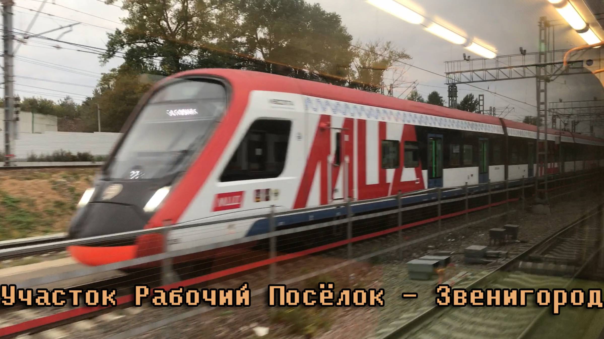 0:00 пл Рабочий Посёлок 0:22 станция Кунцево 0:57 эстакада улица Кубинка 1:08 перегон Кунцево — Одинцово 1:29 пл Сетунь 2:42 перегон Кунцево — Одинцово 3:34 мост через МКАД 3:40 перегон Кунцево — Одинцово 4:00 пл Немчиновка 5:22 перегон Кунцево — Одинцово 7:16 пл Сколково 8:38 перегон Кунцево — Одинцово 9:31 мост, Можайское шоссе 9:37 перегон Кунцево — Одинцово 10:50 пл Баковка 12:04 перегон Кунцево — Одинцово 12:13 станция Одинцово 14:17 пл Одинцово 16:07 станция Одинцово 16:30 мост, улица Маковского 16:35 станция Одинцово 17:25 перегон Одинцово — Голицыно 17:40 мост, Можайское шоссе 17:46 перегон Одинцово — Голицыно 17:55 пл Отрадное, без остановки 18:07 перегон Одинцово — Голицыно 18:59 мост, М-1, "Белоруссия" 19:03 перегон Одинцово — Голицыно 19:13 улица Северная 19:15 перегон Одинцово — Голицыно 19:29 пл Пионерская, без остановки 19:37 перегон Одинцово — Голицыно 20:21 улица первое Успенское шоссе 20:24 пл Перхушково, без остановки 20:33 перегон Одинцово — Голицыно 21:09 мост, Можайское шоссе 21:15 перегон Одинцово — Голицыно 21:49 пл Здравница, без остановки 21:58 перегон Одинцово — Голицыно 23:59 мост, 46К-1021 24:03 перегон Одинцово — Голицыно 24:11 пл Жаворонки, без остановки 24:26 перегон Одинцово — Голицыно 26:03 пл Дачное, без остановки 26:18 перегон Одинцово — Голицыно 28:42 пл Малые Вязёмы, без остановки 29:03 перегон Одинцово — Голицыно 29:34 улица Петровское шоссе 29:38 перегон Одинцово — Голицыно 30:15 мост ЦКАД 30:20 перегон Одинцово — Голицыно 31:07 станция Голицыно 32:00 пл Голицыно 33:18 станция Голицыно 35:13 перегон Голицыно — Звенигород 36:38 улица Можайское шоссе 36:40 перегон Голицыно — Звенигород 37:59 улица А-107 38:03 перегон Голицыно — Звенигород 38:30 пл Захарово (бывшая пл Школьная) 39:51 перегон Голицыно — Звенигород 41:03 мост ЦКАД 41:08 перегон Голицыно — Звенигород 42:54 пл Хлюпино 44:12 перегон Голицыно — Звенигород 45:04 улица А-107 45:08 перегон Голицыно — Звенигород 47:05 пл Скоротово 48:15 перегон Голицыно — Звенигород 49:29 мост ЦКАД 49:35 перегон Голицыно — Звенигород 50:22 улица 46Н-07180 ММК — Кобяково 50:26 перегон Голицыно — Звенигород 51:40 станция Звенигород 53:27 пл Звенигород