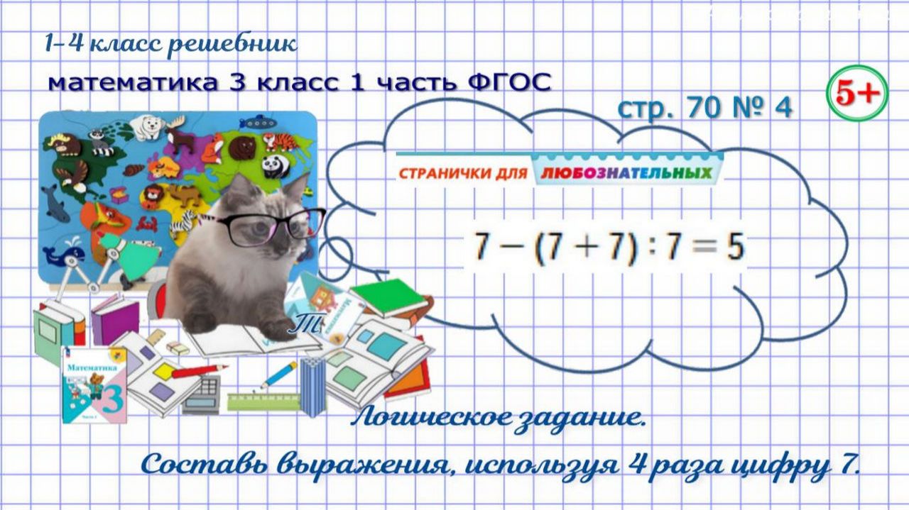 Логическое задание. Составь выражения с результатом 5,6,7,8,9, используя 4 раза цифру 7. Страница 70 номер 4 математика 3 класс 1 часть Моро 2023 г. ФГОС гдз Если нашли ошибку, напишите, пожалуйста, в комментариях. Сайт с текстовым содержанием: https://dzen.ru/id/650204661aba9b0ba4b2643e #обучениематематике#математика3класс1частьстр70номер4#логика#логическоезадание#составьвыраженияиспользуячетыреразацифру7#составьверныеравенства#математика3класс1частьФГОС#математика3кл1чФГОС#математика3класс1частьморо2023#обучениедетей#длядетей#решебникматематика3класс#гдзматематика3класс#начальныеклассы#1-4классрешебник+