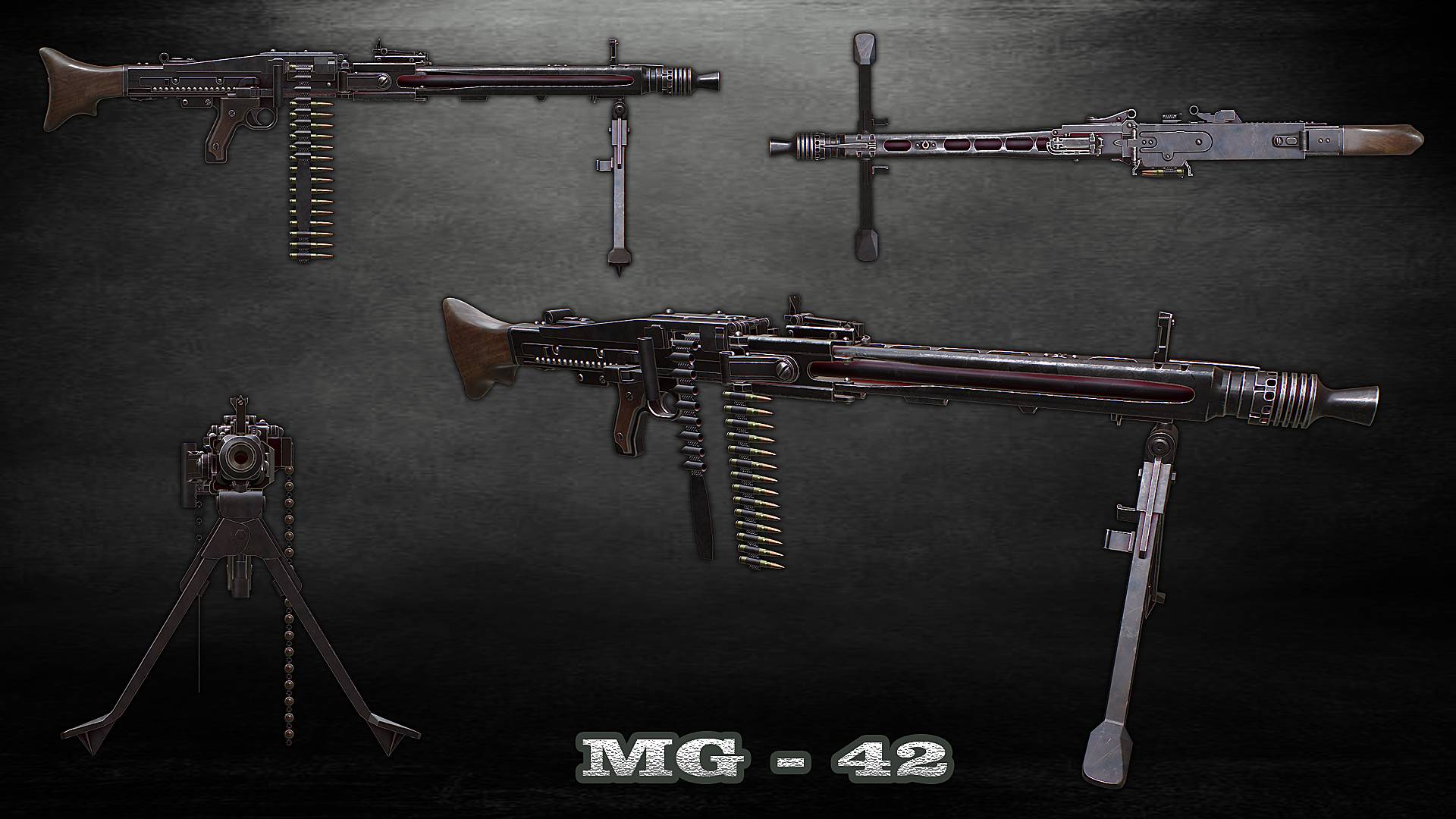 MG 42 3d model polys 82952 verts 82208 tris 162050 MG, 42, war, machine, gun, bundeswehr, german, ww2, wehrmacht, battle, fight, defense, guard, protection, metal, weapon, military, army, nazi, Hello. This is a high definition quality polygon of a MG-42 3d model with PBR textures. Extremely detailed and realistic. Suitable for movie prop, architectural visualizations, advertising renders, games and other. The model contains 114 objects: bipod base, bolt cap, bullet_21, case_21, case_holder_31, end plate, Left bipod, machine gun, reload handle, reload rod, Right bipod, spring_32, trigger. The archive includes Obj and FBX, textures for the Unity: Base color, Metallic, Mixed AO, Normal_OpenGL, Roughness. And also included in the archive textures for UE: BaseColor, Normal, OcclusionRoughnessMetallic. Scene contains 13 materials. If you need, we will make a file of this model for 3D printing especially for you. Original file size: 2.84 GB. Archive file size: 709 MB. https://sketchfab.com/3d-models/mg-42-de75151bd2d04a998f3c8c3715041ccb
