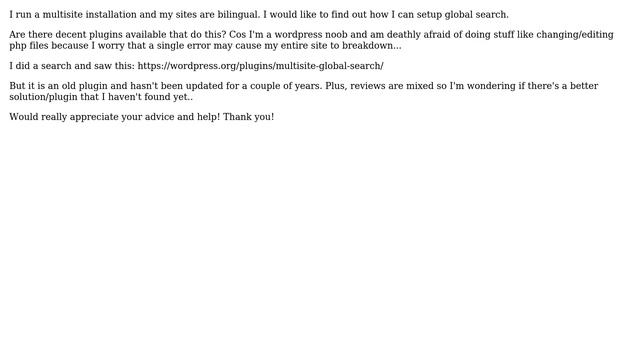 Wordpress: Multisite Installation: how do I setup global search? Helpful? Please support me on Patreon: https://www.patreon.com/roelvandepaar With thanks & praise to God, and with thanks to the many people who have made this project possible! | Content (except music & images) licensed under CC BY-SA https://meta.stackexchange.com/help/licensing | Music: https://www.bensound.com/licensing | Images: https://stocksnap.io/license & others | With thanks to user Misha Rudrastyh (wordpress.stackexchange.com/users/85985), user celebrian (wordpress.stackexchange.com/users/149092), and the Stack Exchange Network (wordpress.stackexchange.com/questions/312442). Trademarks are property of their respective owners. Disclaimer: All information is provided "AS IS" without warranty of any kind. You are responsible for your own actions. Please contact me if anything is amiss at Roel D.OT VandePaar A.T gmail.com