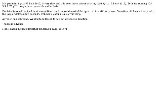 Apple: Why my ipad mini 1 (A1455 Late 2012) is slower than my ipad 3(A1416 early 2012)? Helpful? Please support me on Patreon: https://www.patreon.com/roelvandepaar With thanks & praise to God, and with thanks to the many people who have made this project possible! | Content (except music & images) licensed under CC BY-SA https://meta.stackexchange.com/help/licensing | Music: https://www.bensound.com/licensing | Images: https://stocksnap.io/license & others | With thanks to user Senura Dissanayake (apple.stackexchange.com/users/284767), user Peter Xie (apple.stackexchange.com/users/285372), and the Stack Exchange Network (apple.stackexchange.com/questions/322490). Trademarks are property of their respective owners. Disclaimer: All information is provided "AS IS" without warranty of any kind. You are responsible for your own actions. Please contact me if anything is amiss at Roel D.OT VandePaar A.T gmail.com