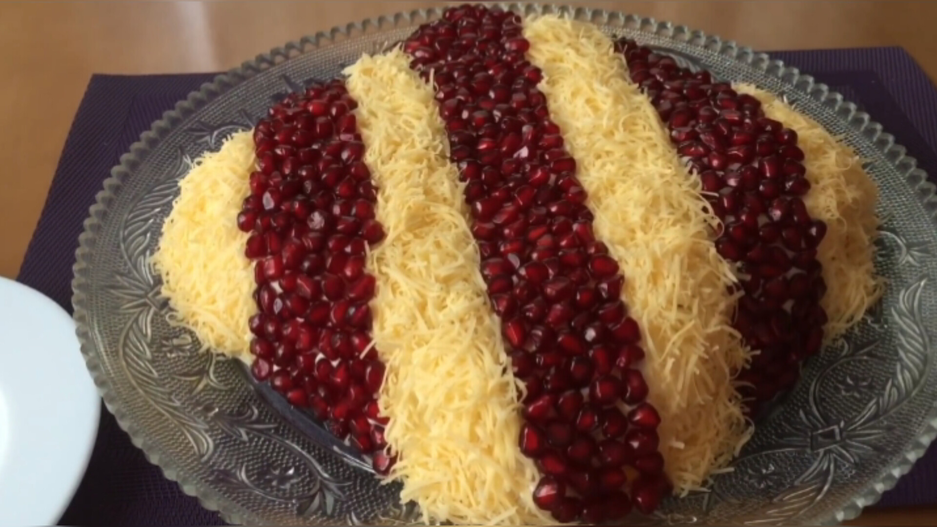 3 яйца 2 больших картофелины 1 большая морковь 400 г куриного мяса 1 банка кукурузы 3 маринованных огурца Соль и перец 300 г майонеза Гранат и сыр сверху - - - - #салат #слоеныйсалат #салатнапраздник #праздничныйсалат #новыйсалат #салатнановыйгод #рецепт