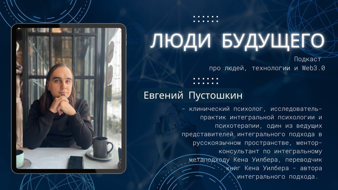 Разговор с интегральным психологом Евгением Пустошкиным. Беседовал Данил Иванов, админ телеграм-канала DAOMetaGo, посвящённого проблематике Web3.0. Обсуждённые темы: 1. Приветствие 2. Основы интегрального подхода. Что это за интегральный подход? И кто такой Кен Уилбер? 3. Выход в русскоязычном пространстве книги Кена Уилбера «Религия будущего». О религии будущего, останется ли она? Если да, то как изменится? 4. Психология будущего? Какие изменения ожидать? 5. Изменится ли в будущем человек? Как? 6. Какие навыки и качества человека будут наиболее важными в будущем? 7. Какое останется место «человеческому» в эпоху всеобщего искусственного интеллекта? 8. Мы все больше и больше погружаемся в цифровую реальность. Как оставаться человеком в цифровом мире? 9. Реальности: виртуальная, дополненная, реальная. Где настоящая? И есть ли она? 10. Цифровая гигиена. Как не сойти с ума в эпоху информационного хаоса? 11. Небольшая практика интегрального подхода. Евгений Пустошкин — клинический психолог, исследователь-практик интегральной психологии и психотерапии, один из ведущих представителей интегрального подхода в русскоязычном пространстве, ментор-консультант по интегральному метаподходу, переводчик книг Кена Уилбера — автора интегрального подхода. Блог и консультации: https://pustoshkin.com (Дата интервью: 06.06.2023)