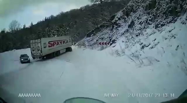 На горной дороге занесло фуру, которая чудом не зацепила легковое авто.