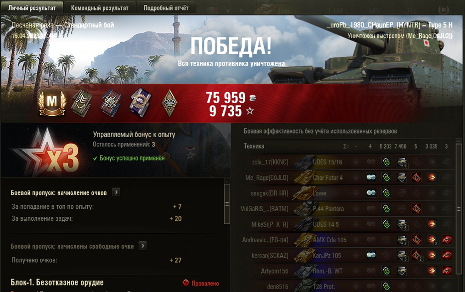 ПЕСЧАНАЯ РЕКА МАСТЕР на Type 5 Heavy ОПЫТ: 1298 СУММАРНОГО УРОНА: 8238 ЗАБЛОКИРОВАЛ БРОНЕЙ: 7450