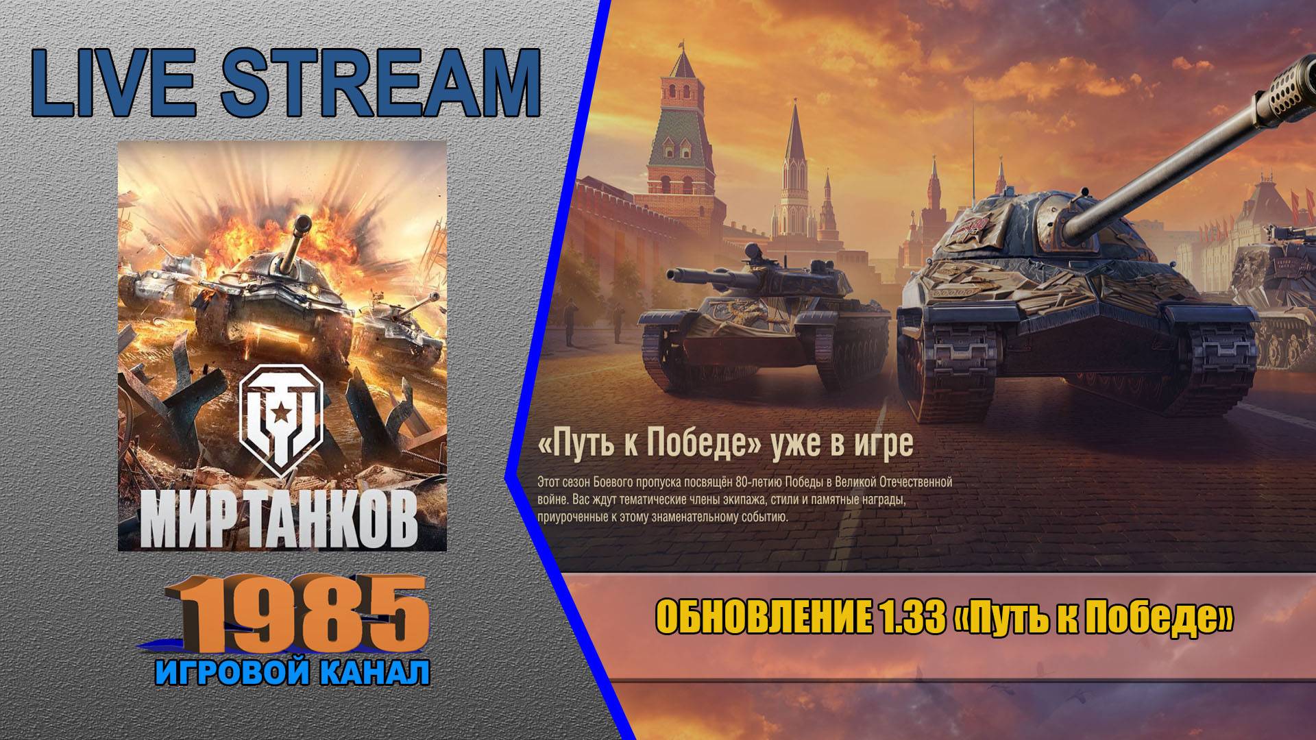✅ Мир Танков●1.33●Stream 12/03/2025 ✅Мы на других платформах: 📌https://t.me/+6RsxIIStwL0xZWIy 📌https://dzen.ru/1985games 📌https://vk.com/games_stream1985 📌https://www.twitch.tv/gamesstream1985 📌https://rutube.ru/channel/774539/ 📌ОБНОВЛЕНИЕ 1.33 «Путь к Победе» Приближается значимый день — День Победы. Очень важно помнить нашу историю и подвиг, что был совершён 80 лет назад. Пусть герои прошлого гордятся нами. А в «Мире танков» вас ждут новая нация, космические путешествия, игровое событие в режиме «Натиск» и множество других внутриигровых активностей. ●▬↓ПРЕЖДЕ ЧЕМ ЗАДАТЬ ВОПРОС - РАЗВЕРНИ МЕНЯ И ПОСМОТРИ!↓▬● ▬▬▬▬▬▬▬▬▬▬▬▬▬▬▬▬▬▬▬▬▬▬▬▬▬▬▬▬▬▬▬▬▬▬▬▬▬▬ 💲💲 💲●ДОНАТ●💲💲💲 💲Поддержать голосовым сообщением (задать вопрос или написать пожелание в прямой эфир) от 10р DONATIONALERTS https://www.donationalerts.com/r/1985_games QiwiDONAT https://donate.qiwi.com/payin/GAMES_STREAM ▬▬▬▬▬▬▬▬▬▬▬▬▬▬▬▬▬▬▬▬▬▬▬▬▬▬▬▬▬▬▬▬▬▬▬▬▬▬ #МирТанков #Путь_к_Победе #1_33