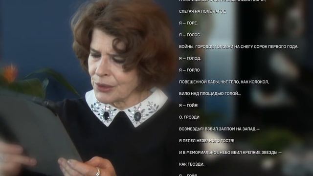 Фанни Ардан читает «Гойю» Вознесенского по-французски. Стихотворение, посвященное Великой Отечественной войне, было включено в первый сборник поэта «Мозаика», вышедший в 1960 году.