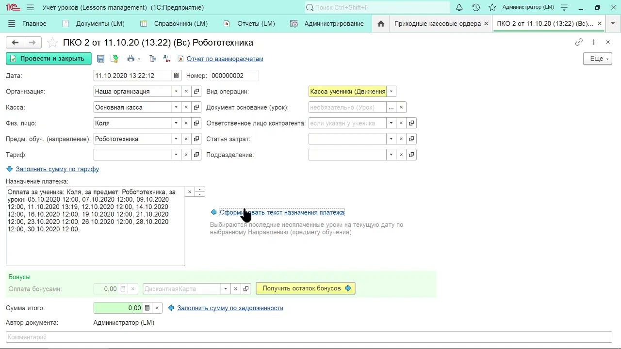 Учет занятий и уроков в 1С: 8.3. Оплата за уроки