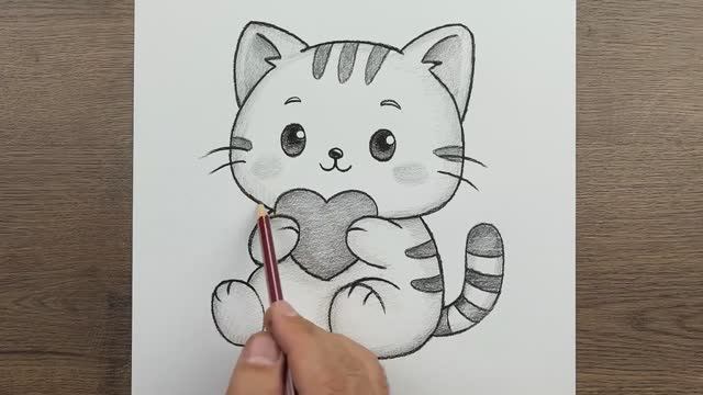 Как нарисовать Милый рисунок Кота, держащего сердце карандашом шаг за шагом